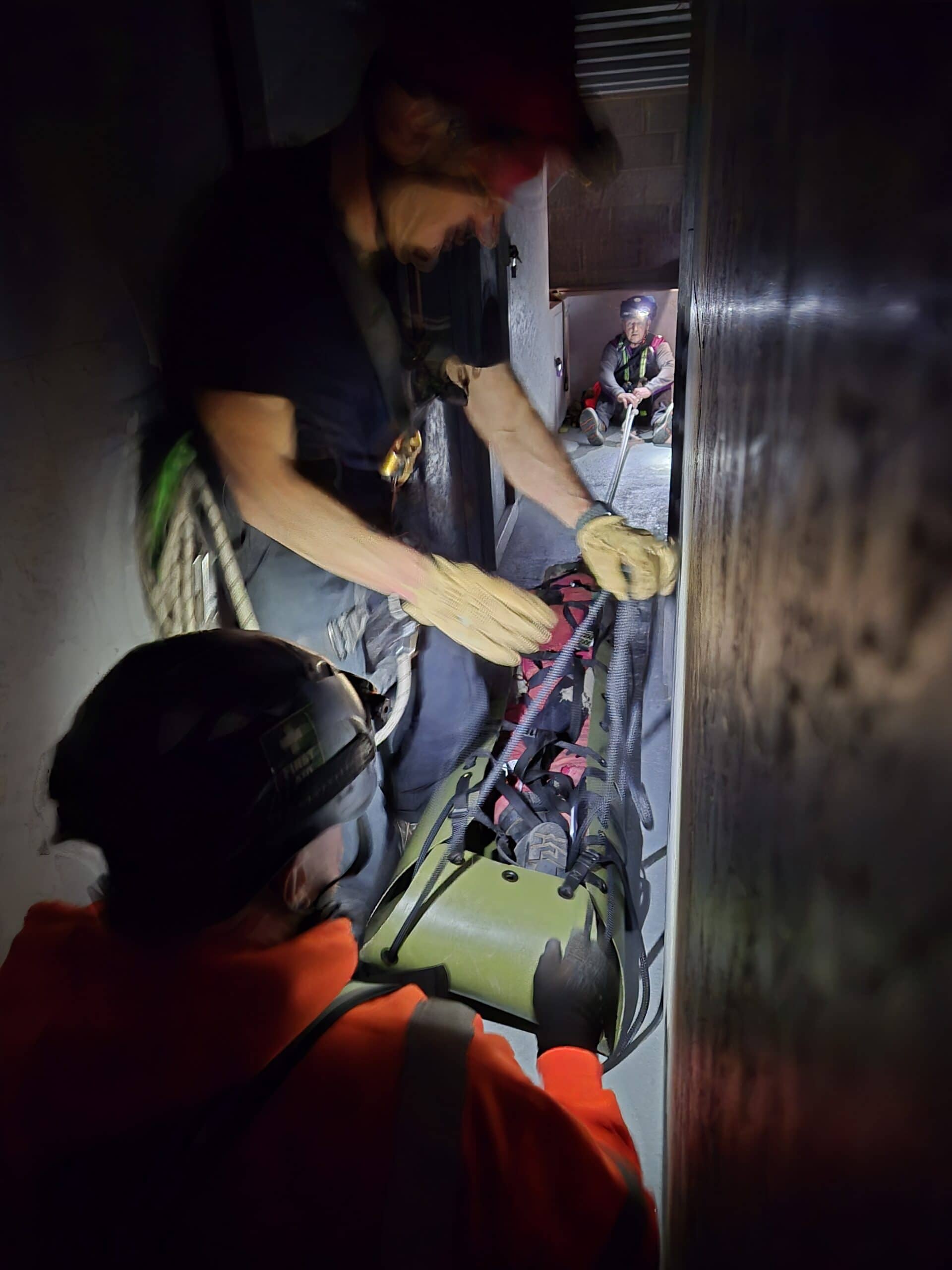 Confined space rescues often require teams to work in restricted environments with limited visibility while wearing breathing apparatus and coordinating complex casualty extraction techniques.